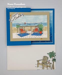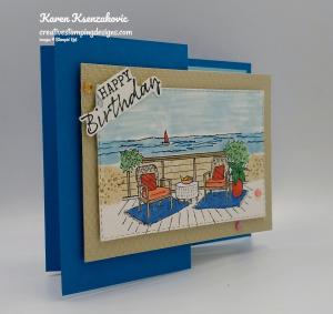 On the Basic White panel I stamped the sentiment from A Good Man stamp set in Tuxedo Black Ink and cut it out using my Tasteful Labels Dies. I adhered the sentiment to the card front using Stampin’ Dimensionals. I cut the smallest circle from the Layering Circles Dies from a scrap of Crushed Curry cardstock and adhered it to the card front using Stampin’ Dimensionals. I stamped the bird image from the Stampin’ Up! By The Dock Cling Stamp Set in Tuxedo Black Ink and colored it in using my Seaside Spray Stampin’ Blends Markers. I cut the bird out using my Dockside Dies and adhered it to the circle using a Stampin’ Dimensional.