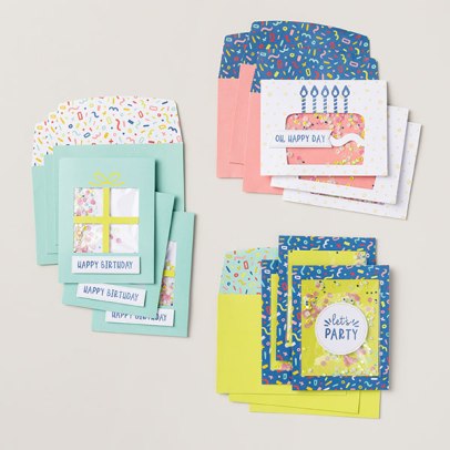 - All the supplies you need to create 9 cards with fun accordion folds: 3 each of 3 designs; and coordinating envelopes.