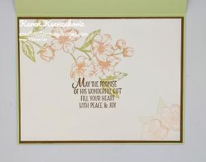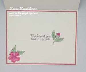On the inside I stamped the sentiment from the Stampin’ Up! Love & Happiness Cling Stamp Set in Flirty Flamingo Ink on a Basic White panel. I stamped the leaf images from the Forever Blossoms stamp set on the bottom of the panel in Garden Green Ink. I adhered the extra die cut flowers using Glue Dots on top of the leaves. I adhered the Basic White panel to the inside of the Basic White Thick card base.