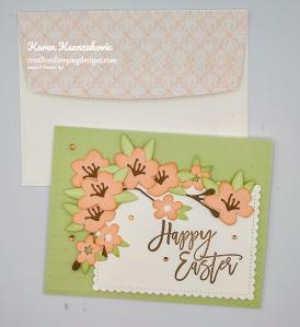 To complete my card, I decorated a Basic White Medium Envelope. I stamped the flower images from the Forever Blossoms stamp set on the envelope front and flap in Flirty Flamingo and Petal Pink Inks. I masked the flowers and stamped the leaf images from the Forever Blossoms stamp set around the flowers in Garden Green Ink.