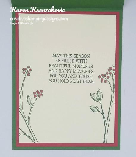 On the inside I stamped the sentiment from the Toile Christmas stamp set in Garden Green Ink in the center of a Very Vanilla panel. I stamped the branch image from the Toile Christmas stamp set on either side of the panel in Garden Green Ink. I colored the berries on the branches in using my Real Red Stampin’ Blends Markers. I adhered the Very Vanilla panel to a Real Red mat using Snail and then to the inside of the Garden Green card base using Multipurpose Liquid Glue.