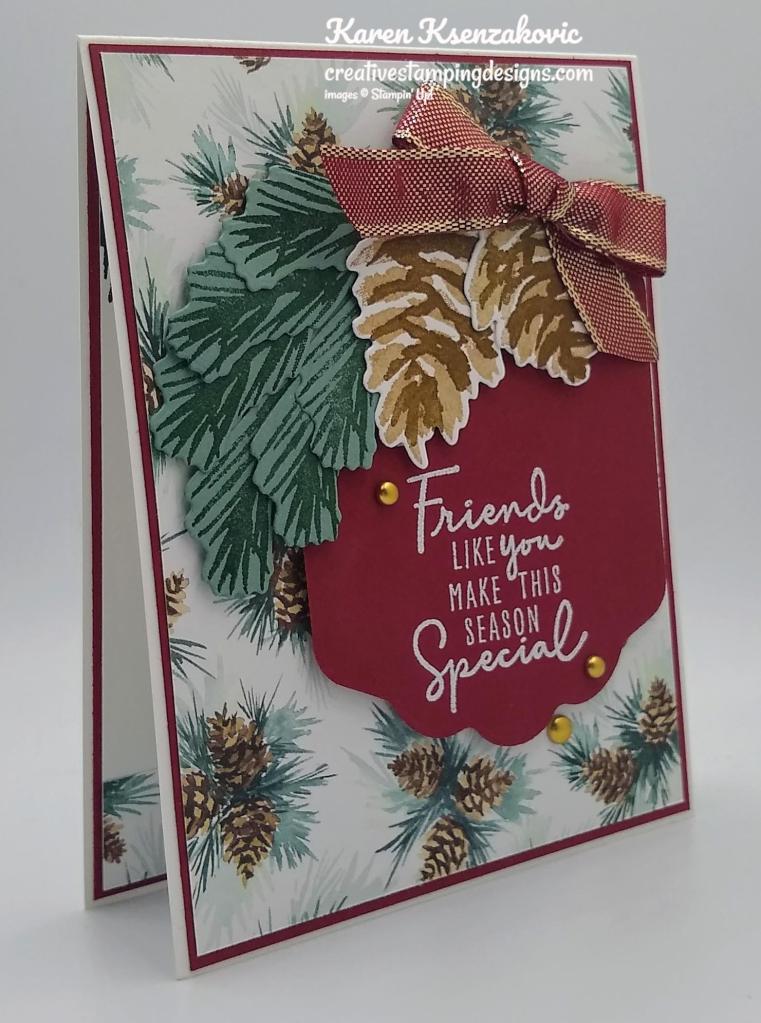 I adhered the Soft Succulent pine boughs to the Evening Evergreen pine boughs. I adhered the detailed pinecones to the solid pinecones. I adhered the layered pinecones to the pine boughs die using Multipurpose Liquid Glue. I adhered the die cut panel to a Cherry Cobbler card front using Multipurpose Liquid Glue.