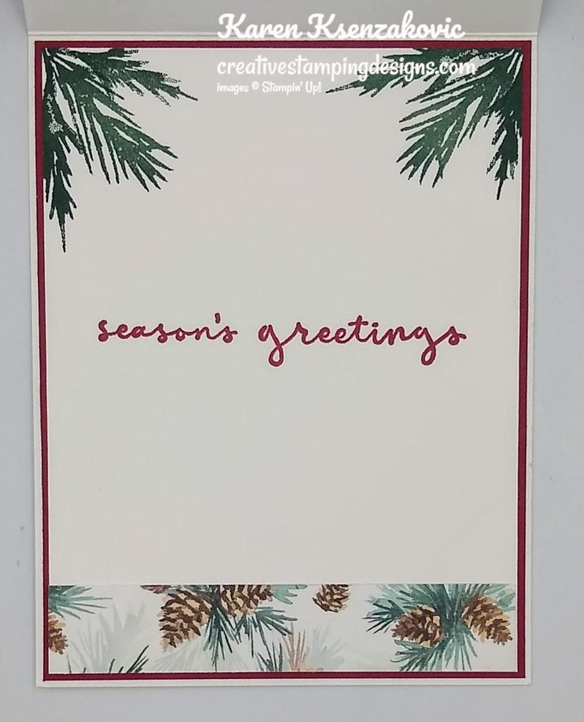 On the inside, I stamped the sentiment from Christmas To Remember stamp set in Cherry Cobbler Ink on a panel of Basic White cardstock. I stamped the pine bough images from the Christmas Season stamp set in Evening Evergreen Ink on the top of the panel. I adhered the Basic White panel to a Cherry Cobbler mat then to the Early Espresso card base.