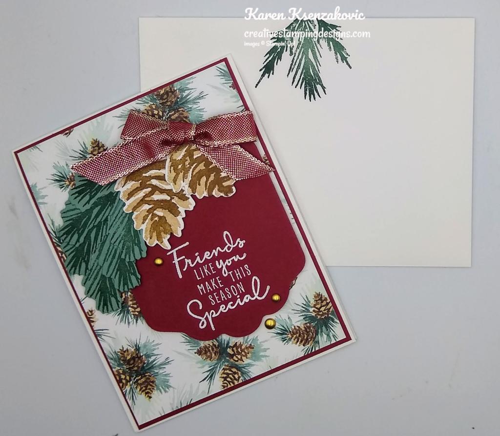 I used the Stampin’ Up! Christmas To Remember Cling Stamp Set and the Stampin’ Up! Christmas Season Photopolymer Stamp Set for my Freestyle Collage Card and I was inspired by the pine boughs and colors in the Christmas Joy photo #182b.