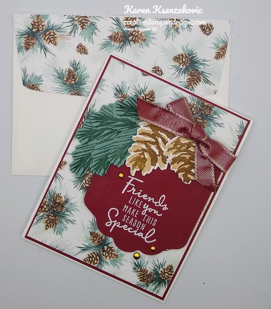 - Early Espresso Cardstock 8 1/2″ X 5 1/2″ (card base scored & folded at 4 1/4″), 2″ X 6″ (pinecones)
