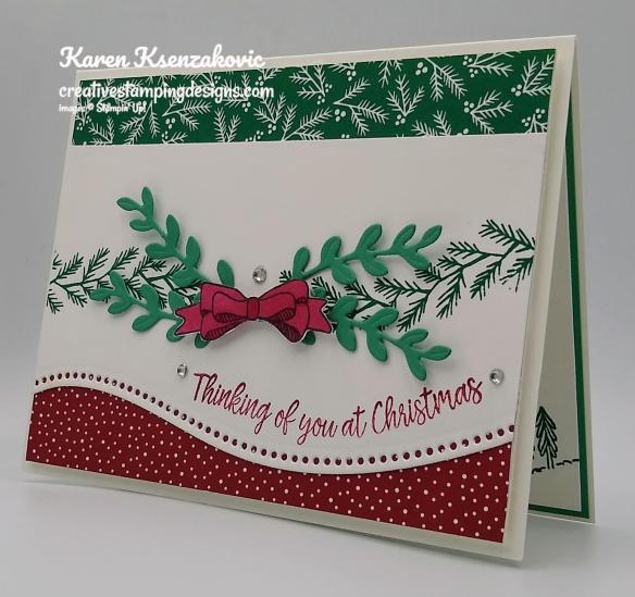 I stamped the sentiment from the Stampin’ Up! Curvy Christmas Photopolymer Stamp Set in Mossy Meadow Ink on a Whisper White panel. I cut the sentiment out using my Stitched So Sweetly Dies. I adhered a piece of the Mossy Meadow 3/16″ Braided Linen Trim (available January5, 2021) to the card front in a zig-zag pattern using a little Stampin’ Seal to hold it in place. I adhered the sentiment over the trim using Stampin’ Dimensionals. I added a couple Cherry Cobbler Holiday Rhinestone Basic Jewels to the sentiment.