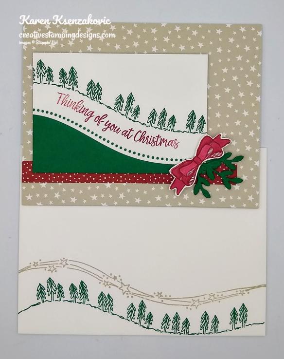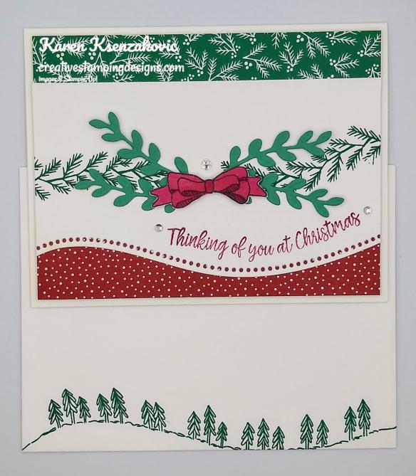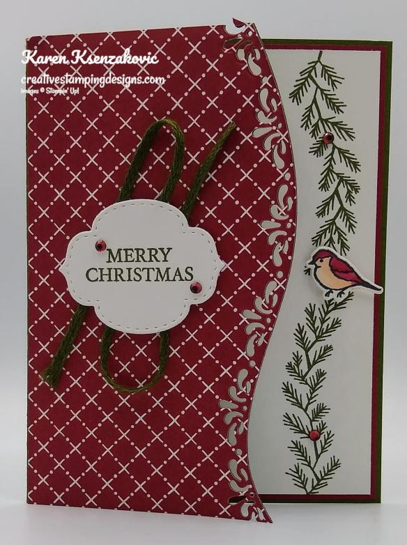 I stamped the sentiment from the Stampin’ Up! Joyful Holly Photopolymer Stamp Set in the center of the Whisper White panel in Mossy Meadow Ink. I adhered the Whisper White panel to a Cherry Cobbler mat using Stampin’ Seal and then to the inside of the Mossy Meadow card base using Multipurpose Liquid Glue. I adhered the bird between the pine boughs using a Stampin’ Dimensional. I added a couple Cherry Cobbler Holiday Rhinestone Basic Jewels to the pine boughs.