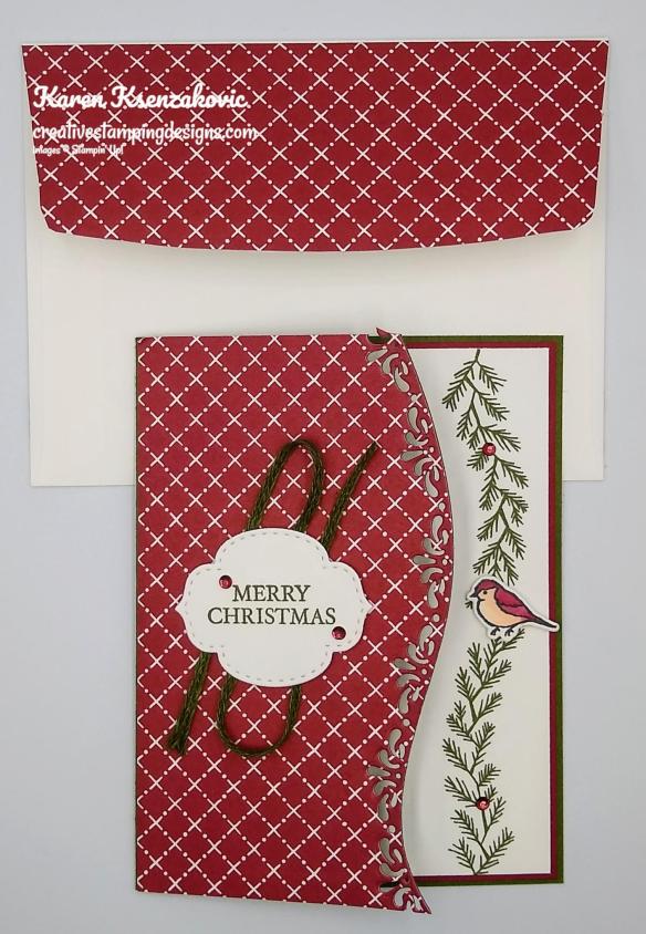 To finish my card I decorated a Medium Whisper White Envelope. I stamped the pine bough image from the Curvy Christmas stamp set in Mossy Meadow Ink on the bottom of the envelope front twice. I stamped the 2 different birds from the Quite Curvy stamp set in Tuxedo Black Memento Ink on the pine boughs facing each other. I colored the birds in using my Cherry Cobbler and Petal Pink Stampin’ Blends Markers. I adhered a panel of the Classic Christmas DSP to the envelope flap.