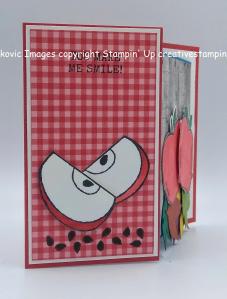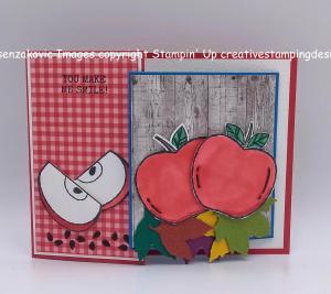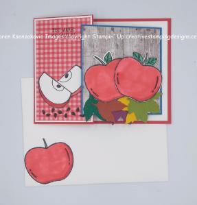 I stamped the apple image from the Harvest Hellos stamp set in Tuxedo Black Memento Ink twice on a Whisper White panel. I colored the images in using my Poppy Parade Stampin’ Blends Markers. I punched the apples out using my Apple Builder Punch. I stamped the stem and leaf images from the Harvest Hellos stamp set in Tuxedo Black Memento Ink on the Whisper White panel. I colored them in using my Crumb Cake and Shaded Spruce Stampin’ Blends Markers. I punched the stems and leaves out using my Apple Builder Punch and adhered them to the apple using Glue Dots. Using my Gathered Leaves Dies I cut out a Cajun Craze, Crushed Curry, Old Olive, Rich Razzleberry and Shaded Spruce leaves. I adhered a woodgrain panel of Come To Gather Designer Series Paper to the front of the Pacific Point card base using Multipurpose Liquid Glue. I adhered the leaves along the bottom of the card front, avoiding the right folded edge, using Glue Dots. I adhered the apples on top of the leaves using Glue Dots and Stampin’ Dimensionals.