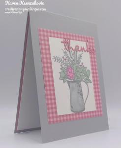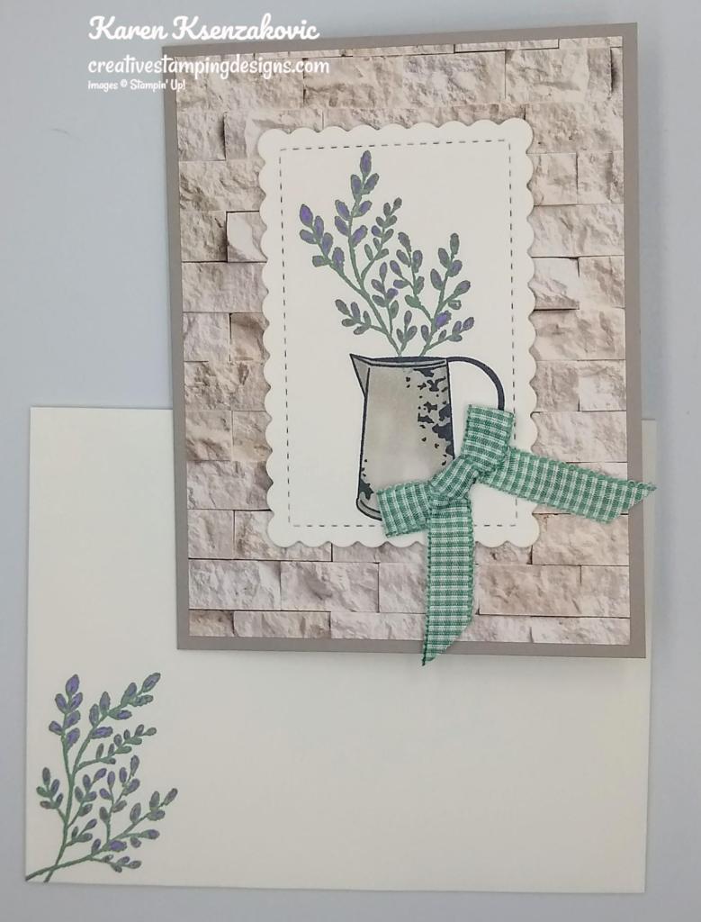 On a panel of Basic White cardstock I stamped the pitcher image from the Stampin’ Up! Country Home Photopolymer Stamp Set in Tuxedo Black Ink. If this is a set that you like, it will be retiring as of May 3rd. I colored the image in using my Gray Granite Stampin’ Blends Markers. I stamped the leafy image from the Tasteful Touches stamp set in Soft Succulent Ink above the pitcher and colored the leaves in using my Highland Heather Stampin’ Blends Markers.
