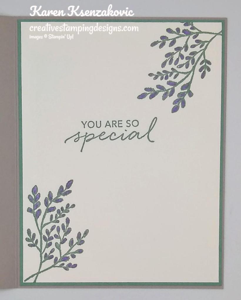 On the inside I stamped the sentiment from the Tasteful Touches stamp set in Soft Succulent Ink in the center of a Basic White panel. I stamped the leafy image from the Tasteful Touches stamp set in Soft Succulent Ink on the corners of the panel and colored the leaves in using my Highland Heather Stampin’ Blends Markers. I adhered the Basic White panel to a Soft Succulent mat using Stampin’ Seal and then to the inside of the Gray Granite card base using Multipurpose Liquid Glue.