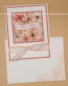On the inside I stamped the solid cross from the Hold On To Hope stamp set in Sahara Sand Ink stamping off once in the center of a Whisper White panel. I stamped the foliage from the same stamp set around the corners in Tranquil Tide Ink. I stamped the butterfly by the cross in Fresh Fig Ink stamping off once. I stamped the sentiment from the Stampin’ Up Itty Bitty Greetings Stamp Set in Fresh Fig Ink. I adhered the Whisper White panel to a Fresh Fig mat using Snail and then to the inside of the Sahara Sand card base using Multipurpose Liquid Glue.