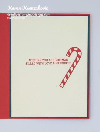 On the inside I stamped the sentiment from the Cup of Christmas stamp set in Poppy Parade Ink in the center of a Very Vanilla panel. I adhered the Very Vanilla panel to a Pretty Peacock mat using Snail and then to the inside of the Poppy Parade card base using Multipurpose Liquid Glue. I added a candy cane which I cut and put together using the Cup of Cheer Dies. I cut the base in Very Vanilla and the top in Poppy Parade.