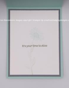 I fussy cut one of the flowerpot images from a panel of the Bloom Where You’re Planted DSP using my Paper Snips. I adhered the Soft Succulent sprigs to the back of the flowerpot using Stampin’ Seal. I adhered the sunflower bouquet to the front of the flowerpot using Glue Dots then adhered the arrangement to the card front using Stampin’ Dimensionals. I added a few Rhinestone Basic Jewels to the card front.
