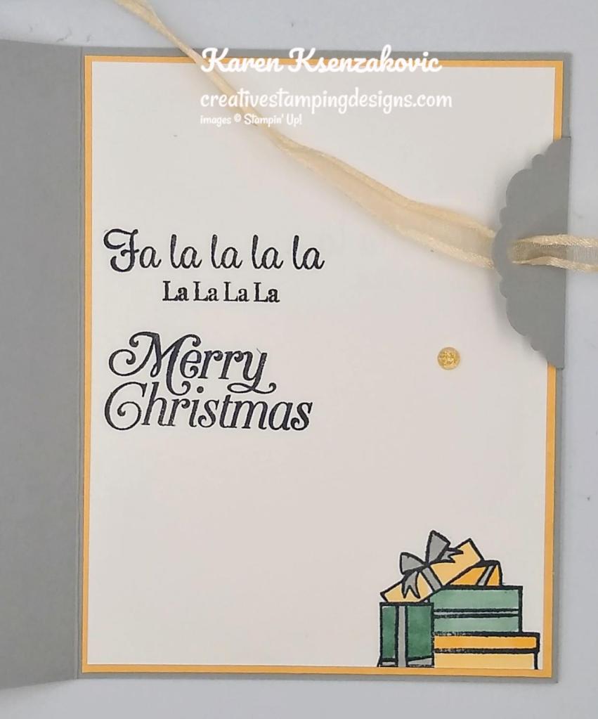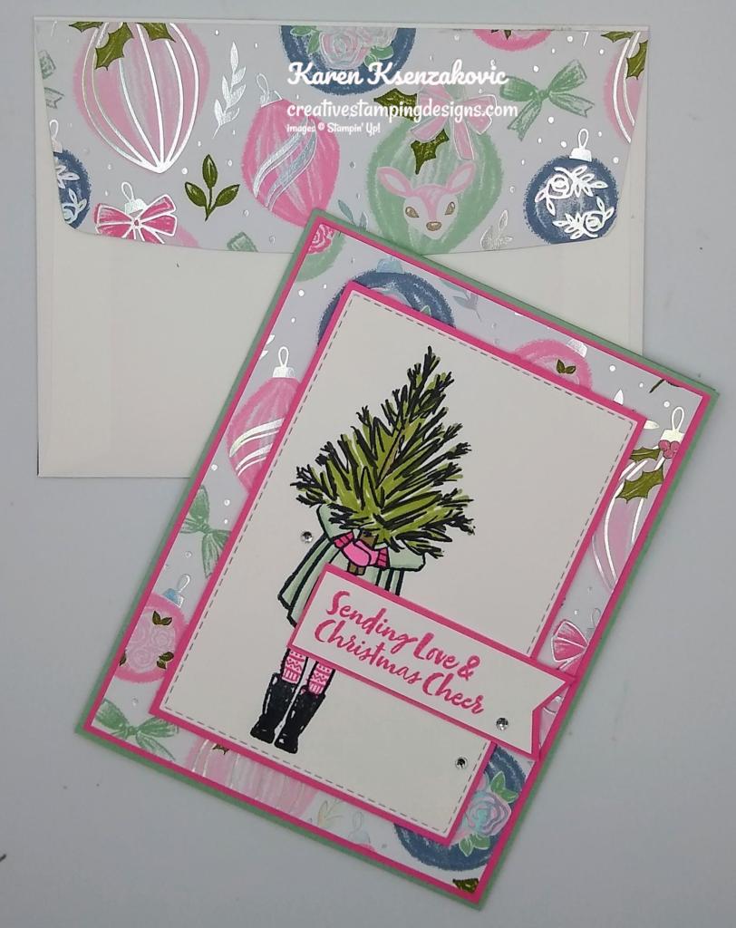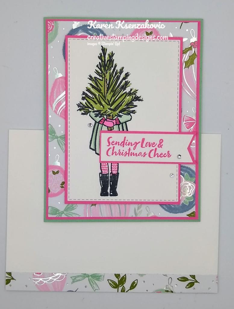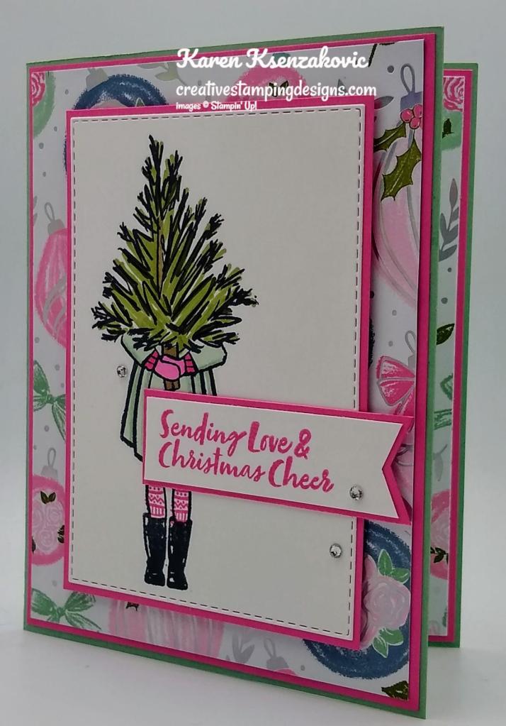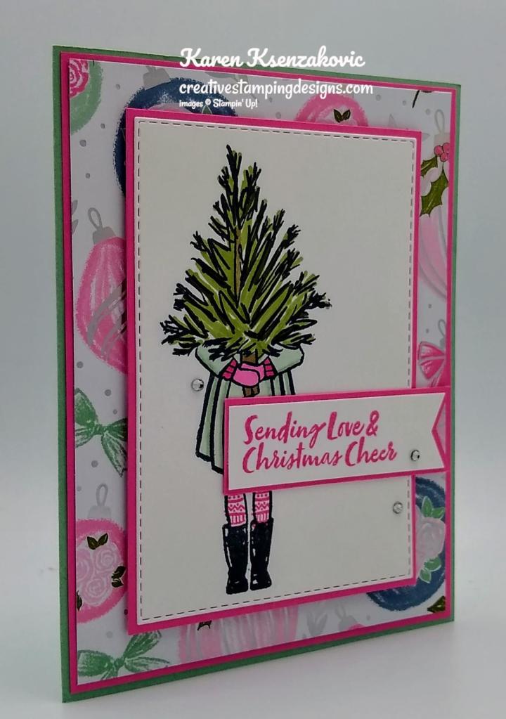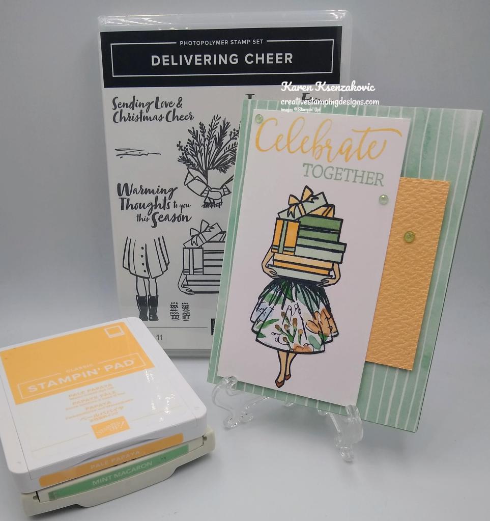 I used the Stampin’ Up! Delivering Cheer Photopolymer Stamp Set along with the Tidings of Christmas 6 X 6 Designer Series Paper for my card today.
