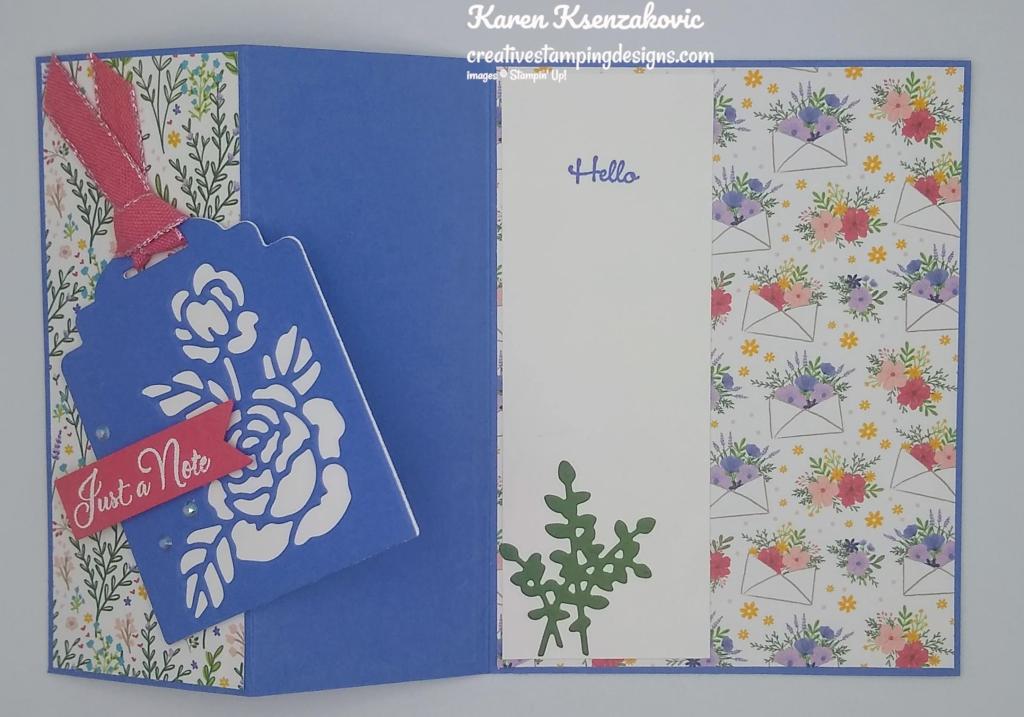 On the inside, I stamped the sentiment from the Country Birdhouse stamp set in Gray Granite Ink. I stamped the bird and flower images from the Country Birdhouse stamp set in Gray granite Ink on the bottom of the panel. I colored the images using Cajun Craze, Daffodil Delight, Gray Granite, Peach Pie and Summer Splash Stampin’ Blends Markers. I adhered the Basic Whit panel to a Basic Beige mat then to the inside of the Misty Moonlight card base.