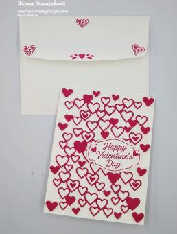 To finish my card I decorated a Medium Whisper White Envelope. I stamped the envelope flap with the small heart images from the Heart To Heart stamp set in Lovely Lipstick Ink. I still had a lot of hearts left over from the Detailed Hearts Dies, so I adhered them to the envelope front. So without all the extra hearts adhered on the card front, inside the card and on the envelope, you can probably finish this card in about 15 minutes.