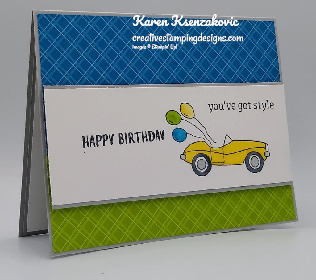 I used the Stampin’ Up! Sala-a-bration Driving By Cling Stamp Set along with the Sale-a-bration Simply Marbleous 6 X 6 Designer Series Paper and the New Horizon Designer Series Paper for my card today.