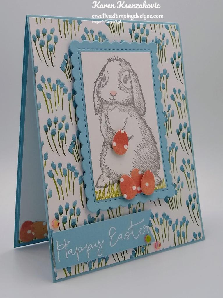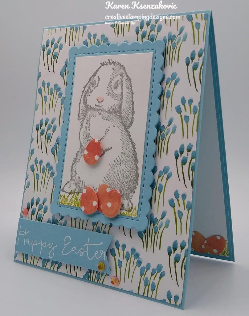 I used the Stampin’ Up! Easter Friends Cling Stamp Set along with the You’re A Peach Designer Series Paper for my clean and simple card today. The Bunnies and colors were my inspiration from the photo.