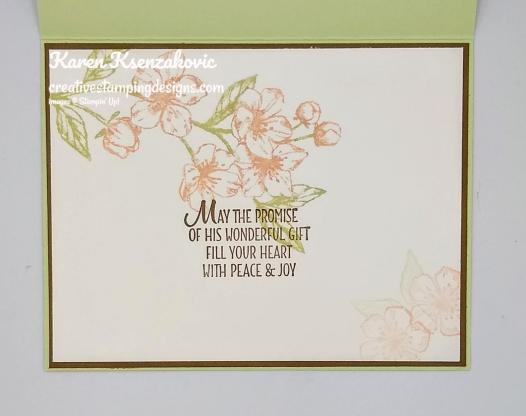 On the inside I stamped the sentiment from the Easter Promise stamp set in Tuxedo Black Memento Ink in the center of a Whisper White panel. I stamped the cross image from the Easter Promise stamp set in Highland Heather Ink above the sentiment. I colored the leaves on the vine with my Light Granny Apple Green Stampin’ Blends Marker. I adhered the Whisper White panel to a Calypso Coral mat using Snail and then to the inside of the Whisper White card base using Multipurpose Liquid Glue.