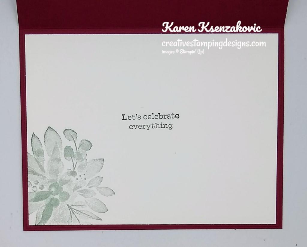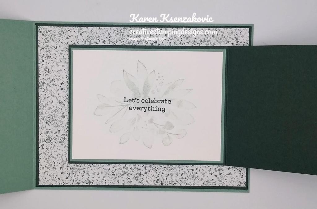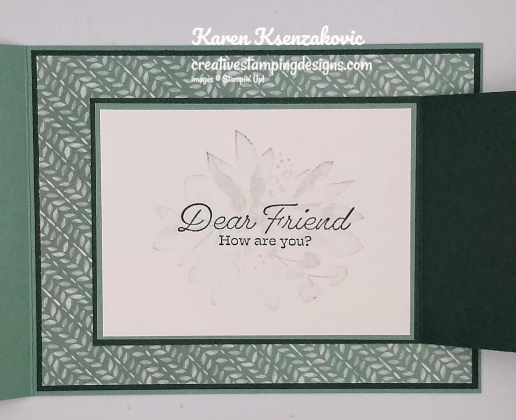 On the inside I stamped the floral image from the Eden’s Garden stamp set in Soft Succulent Ink in the center of a Basic White panel. I stamped the sentiment from the Eden’s Garden stamp set in Evening Evergreen Ink on top of the floral image. I adhered the Basic White panel to a Soft Succulent mat and then to the inside of the Evening Evergreen card base.