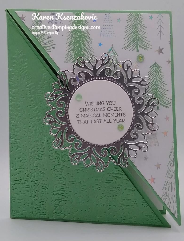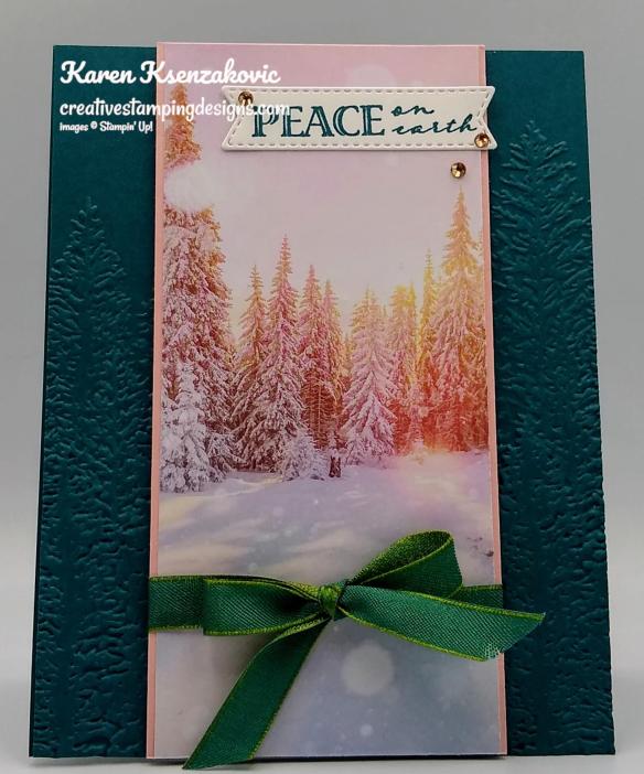 I used the Stampin’ Up! Delivering Cheer Photopolymer Stamp Set along with the Tidings of Christmas 6 X 6 Designer Series Paper for my card today.