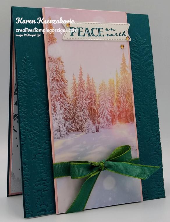 I started by embossing an Evening Evergreen card front using the Evergreen Forest 3D Embossing Folder. I adhered a panel of Tidings of Christmas DSP to one side of the card front using Multipurpose Liquid Glue.