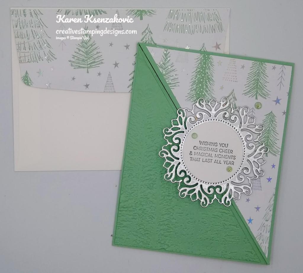 To complete my card I adhered a strip of the Tidings of Christmas DSP to the envelope front and a panel to the envelope flap.