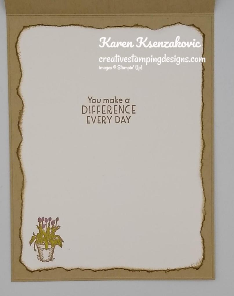 On the inside I stamped the sentiment, flowerpot and vine images from the Feels Like Home SAB stamp set in Tuxedo Black Ink on a Basic White panel. I adhered the panel to a Basic Black mat using Stampin’ Seal and then to the inside of the Basic Black card base using Multipurpose Liquid Glue.