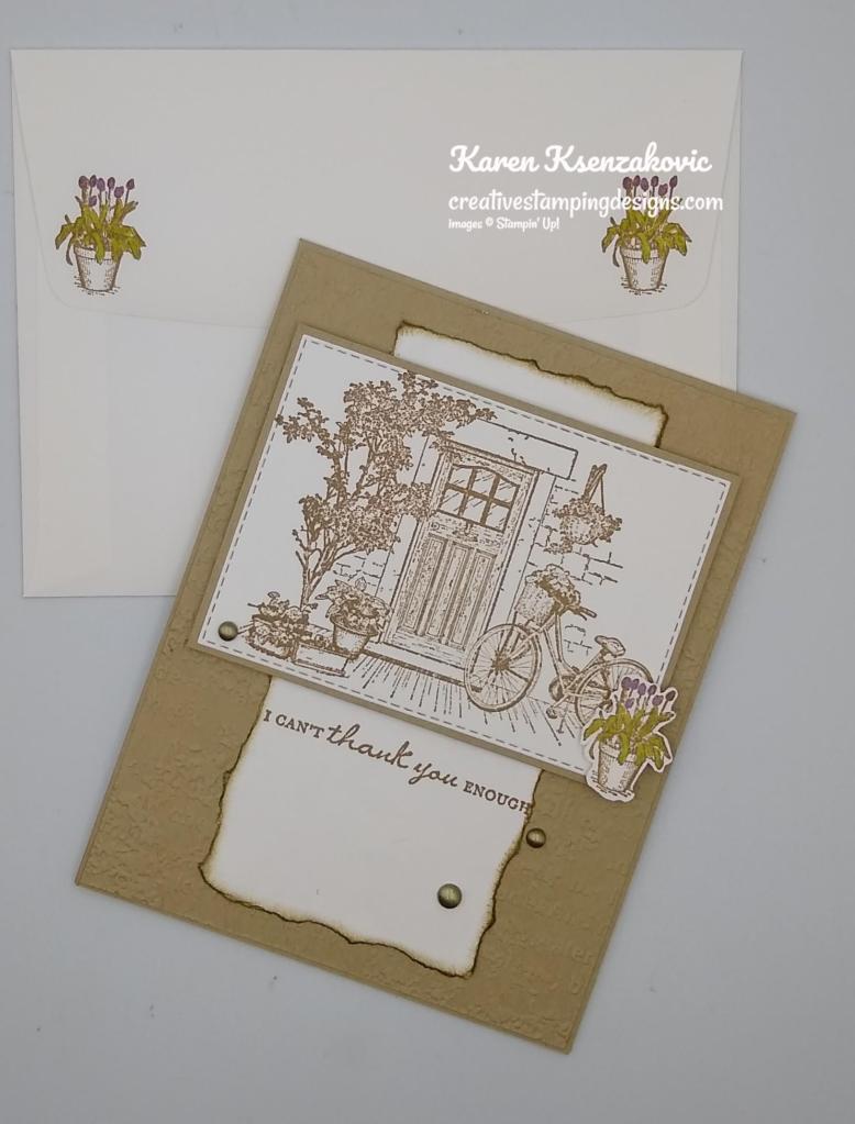 To finish my card I decorated a Basic White Medium Envelope. I stamped the flower pot image from the Feels Like Home SAB stamp set in Tuxedo Black Ink on the envelope front. I adhered a panel of the Beautifully Penned SAB DSP on the envelope flap.