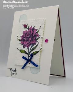 - Basic White Cardstock 2 – 4″ X 5 1/4″ (card front and inner liner), 1 5/8″ X 3 7/8″ (embossed panel), 2 1/2″ X 5 1/2″ (rose, leaves and sentiment)