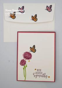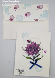 To finish my card I decorated a Basic White Medium Envelope. I stamped the rose image from the Flowering Blooms stamp set on the envelope front coloring it the same as I did for the card. I adhered a panel of True Love DSP to the envelope flap.