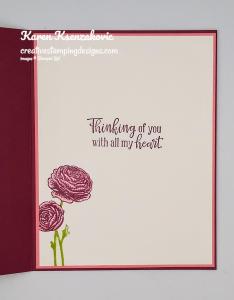 On the inside I stamped the sentiment from the Flowering Blooms stamp set in Just Jade Ink on a Basic White panel. I stamped the rose image from the Flowering Blooms stamp set on the bottom of the panel, coloring the stamp using my Just Jade and Melon Mambo Stampin’ Write Markers. I adhered the Basic White panel to a Melon Mambo mat using Stampin’ Seal and then to the inside of the Basic Black card base using Stampin’ Seal.