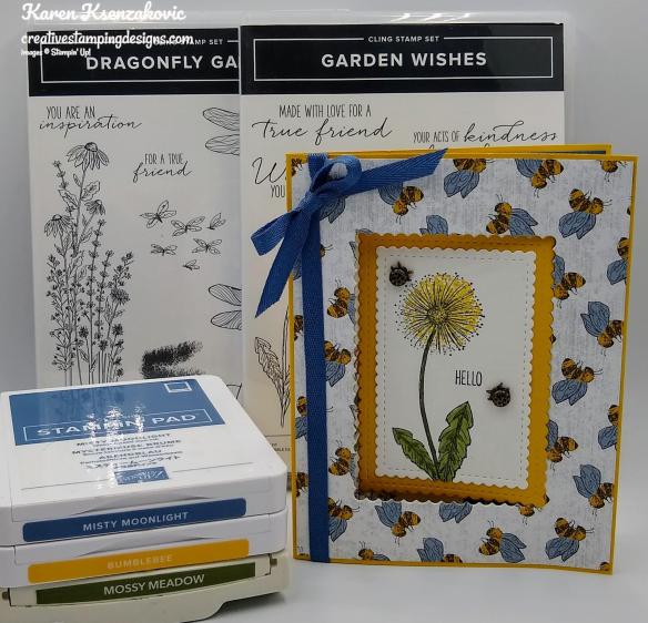Today’s card is one that we’re making at my card class tonight. This is the 1st class in over a year that I’m having. I’m really hoping this will be the 1st of many monthly classes again. I used the Stampin’ Up! Dragonfly Garden Cling Stamp Set and the Stampin’ Up! Garden Wishes Cling Stamp Set for my card. My card is similar to one a did a while back, one of the ladies coming asked about making it. Here’s my card for today.