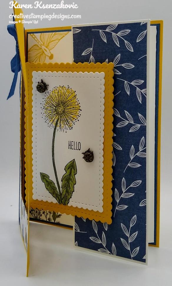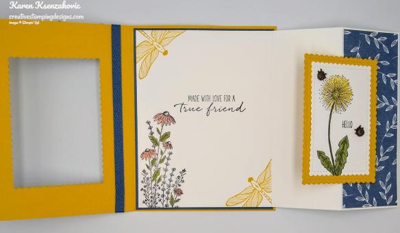 On the inside I stamped the sentiment from the Garden Wishes stamp set in the center of a Basic White panel using Mossy Meadow Ink. I stamped the dragonfly image from the Dragonfly Garden stamp set in Bumblebee Ink on the top and bottom corners of the panel. I adhered the Basic White panel to a Mossy Meadow mat using Stampin’ Seal and then to the inside of the Bumblebee card base using Multipurpose Liquid Glue.
