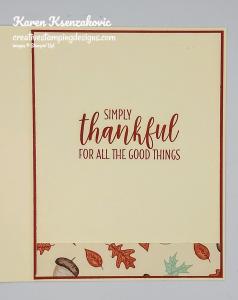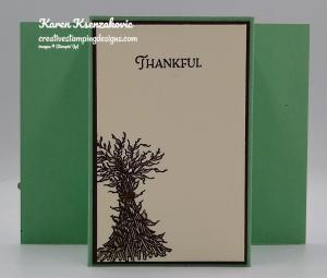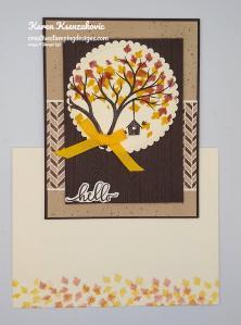 On the inside I stamped the tree trunk image from the Rooted In Nature stamp set in Crumb Cake Ink, stamping off twice, in the center of a Very Vanilla panel. I stamped the sentiment from the Life Is Beautiful stamp set in Crumb Cake in over the trunk image. I stamped the leaves from the Life Is Beautiful stamp set along the bottom of the panel in Cherry Cobbler Ink. I adhered the Very Vanilla panel to a Cherry Cobbler mat using Stampin’ Seal and then to the inside of the Crumb Cake card base using Multipurpose Liquid Glue.