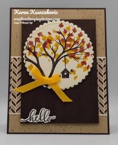 On a small panel of Very Vanilla cardstock, I stamped the tree trunk image from the Stampin’ Up! Rooted Ink Nature Cling Stamp Set in Crumb Cake Ink, stamping off once. I cut the image out using the circle from the Stitched Shapes Dies. I stamped the sentiment from the Life Is Beautiful stamp set in Crumb Cake Ink towards the top of the circle and adhered it to the very vanilla panel using Multipurpose Liquid Glue. I cut 2 leaves out using the Gathered Leaves Dies, 1 in Cherry Cobbler and 1 in Brushed Metallic paper. I adhered the leaves to the tree trunk image using Glue Dots. I made a triple bow using Linen Thread and adhered it to the leaves using a Glue Dot. I adhered the artwork to the card front using Stampin’ Dimensionals. I added a few Cherry Cobbler Holiday Rhinestone Basic Jewels to the card front.