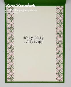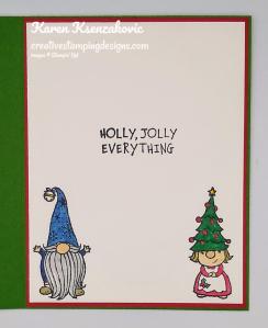 On the inside I stamped the sentiment from the Gnome For The Holidays stamp set in Shaded Spruce Ink in the center of a Whisper White panel. I stamped another one of the gnome images from Gnome For The Holidays stamp set in Tuxedo Black Memento Ink on the bottom of the panel. I colored the image in using my Cherry Cobbler, Gray Granite, Ivory, Just Jade and Petal Pink Stampin’ Blends Markers. I adhered thin strips of the ‘Tis The Season DSP on the bottom and top of the panel using Stampin’ Seal. I adhered the Whisper White panel to a Cherry Cobbler mat using Stampin’ Seal and then to the inside of the Cherry Cobbler card base using Multipurpose Liquid Glue.