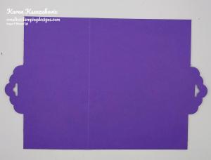 - Cherry Cobbler Cardstock 4 1/4″ X 11″ (card base scored and folded at 5 1/2″), 4 1/4″ X 3″ (scalloped oval), 1/4″ X 4″ (strip under sentiment), 4 1/8″ X 5 3/8″ (inner liner mat)