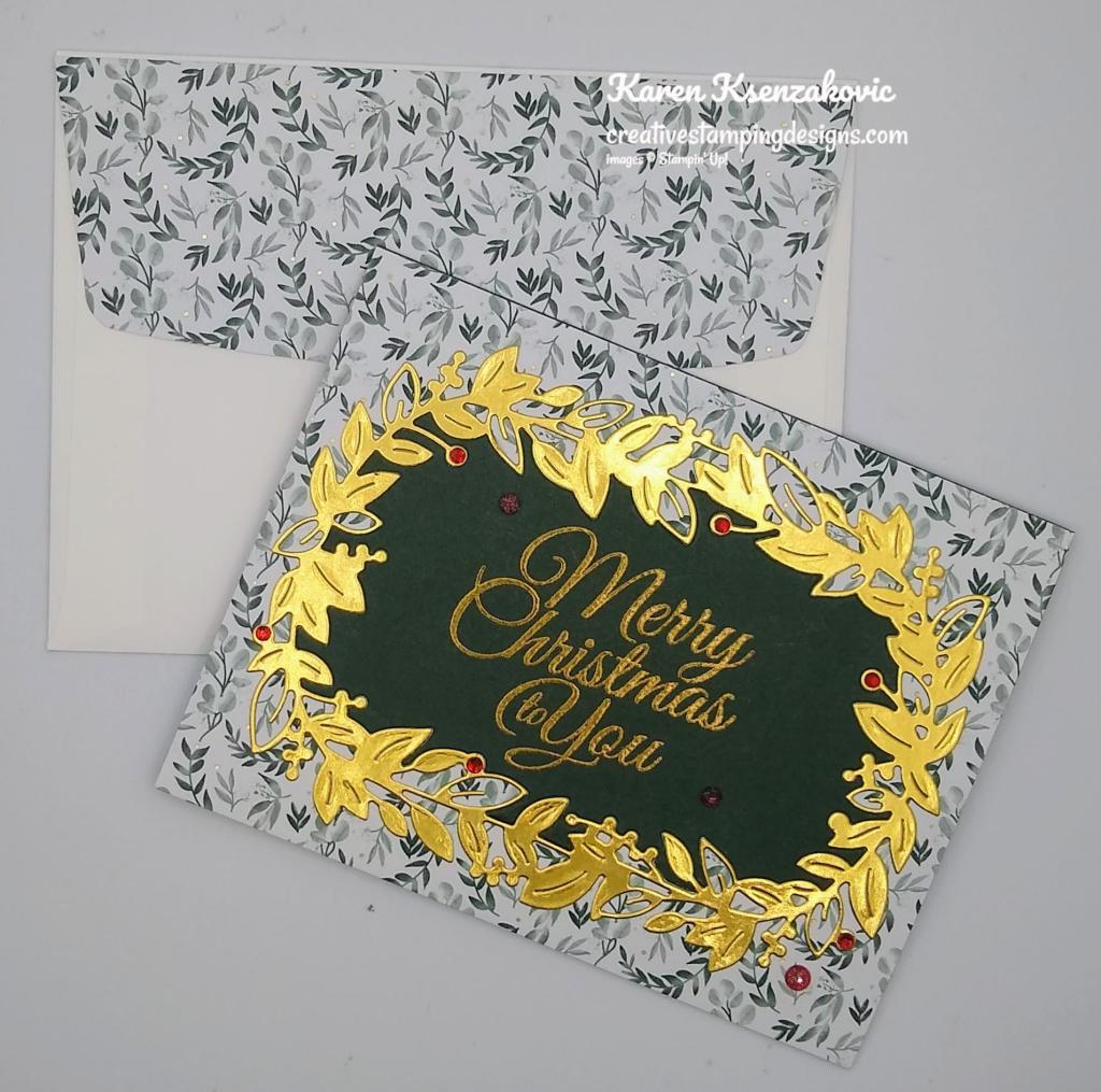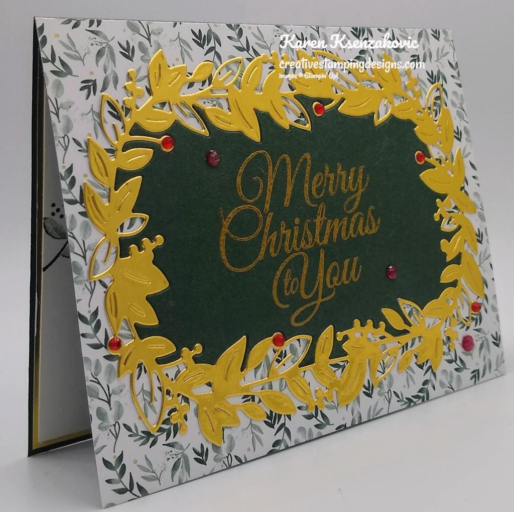 I used the Stampin’ Up! Snowflake Kisses Bundle along with the Elegant Pine Snowflakes Designer Series Paper, Traditional Labels Dies, Stampin’ Up! Delicate Pines Photopolymer Stamp Set, Gold Foil Sheets and Vellum Specialty Paper (available Nov 4th) for my card today.