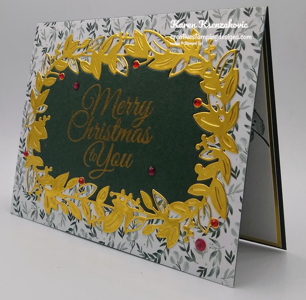Adhere the panel of Elegant Pine Snowflakes DSP to the Gold Foil Mat. Adhere the layered panel to the front of the Secret Sea card base.