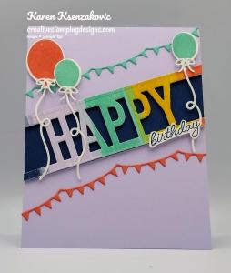 I cut 3 of the small balloons out using the Happy Dies one in Granny Apple Green, one in Highland Heather and one in Mango Melody. I embossed the Granny Apple Green and Highland Heather balloons using the Wrapped In Texture Embossing Folder. I cut the 3 strings and 3 bows from a panel of Magenta Madness cardstock using the Happy Dies. I adhered the strings to the back of the balloons using Glue Dots and the bows to the bottom of the balloons using a tiny amount of Multipurpose Liquid Glue. I adhered the balloons to the card front using Stampin’ Dimensionals. I adhered the #1 to the Mango Melody balloon. I adhered the letters to the card front the way I wanted them and adhered the die cut birthday under the happy using Stampin’ Dimensionals. I added some Artistry Blooms Adhesive-Backed Sequins to the card front. I adhered the card front to a Granny Apple Green mat using Stampin’ Seal and then to a Magenta Madness card base using Stampin’ Dimensionals.