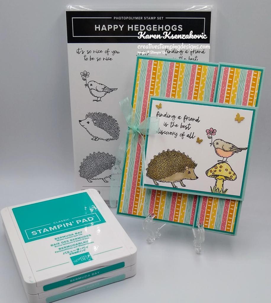 I used the Stampin’ Up! Happy Hedgehogs Photopolymer Stamp Set along with the Stampin’ Up! Go To Greetings Cling Stamp Set and Delightfully Eclectic Designer Series Paper for my card today. I was inspired by the entire photo and colors for my Clean & Layered card today.