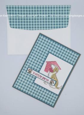 To finish my card I decorated a Medium Whisper White Envelope. I stamped the dog image from the Happy Tails stamp set in Early Espresso Ink on the bottom front of the envelope. I stamped the spot image from the Happy Tails stamp set on the dog in Crumb Cake Ink, stamping off once. I stamped the collar image from the Happy Tails stamp set in Tuxedo Black Memento Ink on the dog image. I stamped the heart outline from the Happy Tails stamp set in Real Red Ink on the collar. I stamped the pawprint image from the Happy Tails stamp set in Early Espresso Ink around the left side of the envelope front. I adhered a panel of Real Red Regals 6 X 6 DSP to the envelope flap.