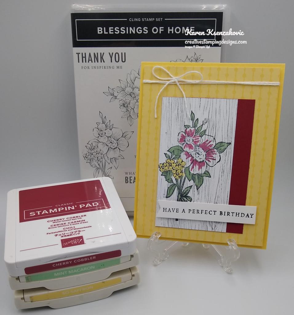 I used the Stampin’ Up! Blessings of Home Cling Stamp Set along with the Stampin’ Up! Calming Camellia Cling Sale-a-bration Host Stamp Set and the Heart & Home Designer Series Paper for my card today.