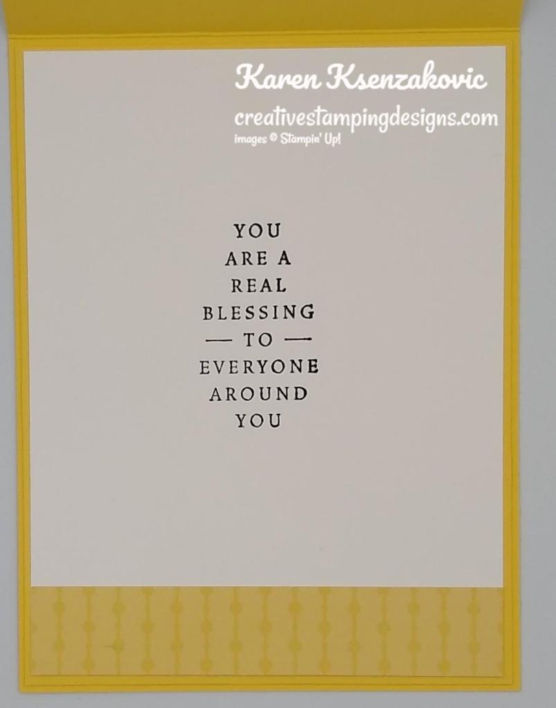 On the inside I stamped the sentiment from the Calming Camellia stamp set in Basic Gray Ink on a Basic White panel. I stamped the smaller floral image from the Blessings of Home stamp set in Smoky Slate Ink on the bottom of the panel. I colored just the larger flower using my Balmy Blue Stampin’ Blends Markers. I adhered the Basic White panel to a Balmy Blue mat and then to the inside if the Basic Gray card base.