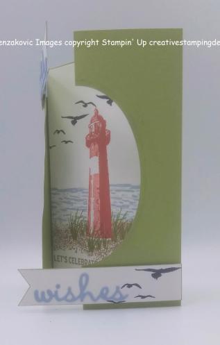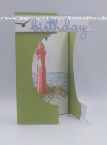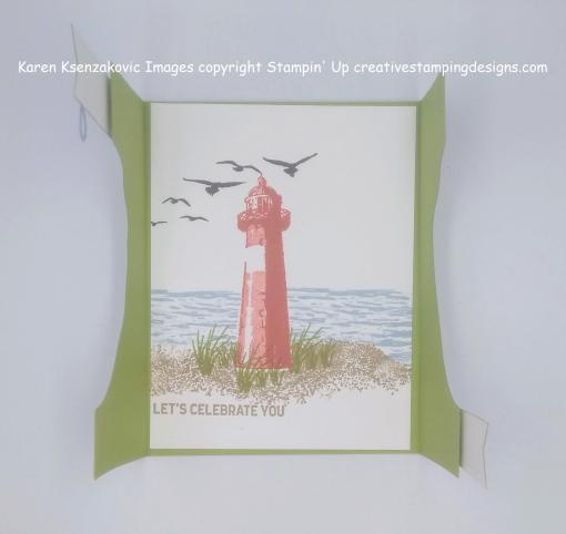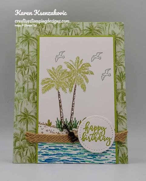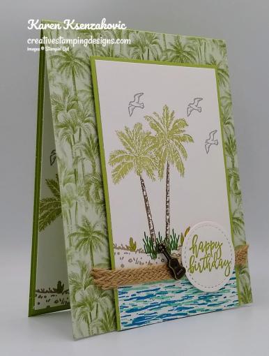 On a panel of Whisper White cardstock I stamped the palm tree and Adirondack chair images from the Stampin’ Up! Seaside View Cling Stamp Set in Soft Suede Ink. I stamped the sand image from the Stampin’ Up! High Tide Photopolymer Stamp Set in Sahara Sand Ink multiple times on the bottom of the panel. I stamped the grass image from the High Tide stamp set in Just Jade Ink around the palm tree. I colored the sky using my Balmy Blue and Pool Party Stampin’ Blends Markers. I stamped the birds from the Seaside View stamp set in Soft Suede Ink. I colored all the images in using my Cinnamon Cider, Crumb Cake, Daffodil Delight, Just Jade, Misty Moonlight and Smoky Slate Stampin’ Blends Markers.