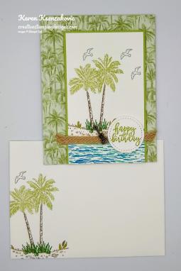 To finish my card I decorated a Medium Whisper White Envelope. I stamped the palm tree and bird images from the Seaside View stamp set in Soft Suede Ink on the envelope front. I colored the images in using my Crumb Cake, Just Jade and Smoky Slate Stampin’ Blends Markers. I adhered a panel of In Good Taste DSP to the envelope flap.