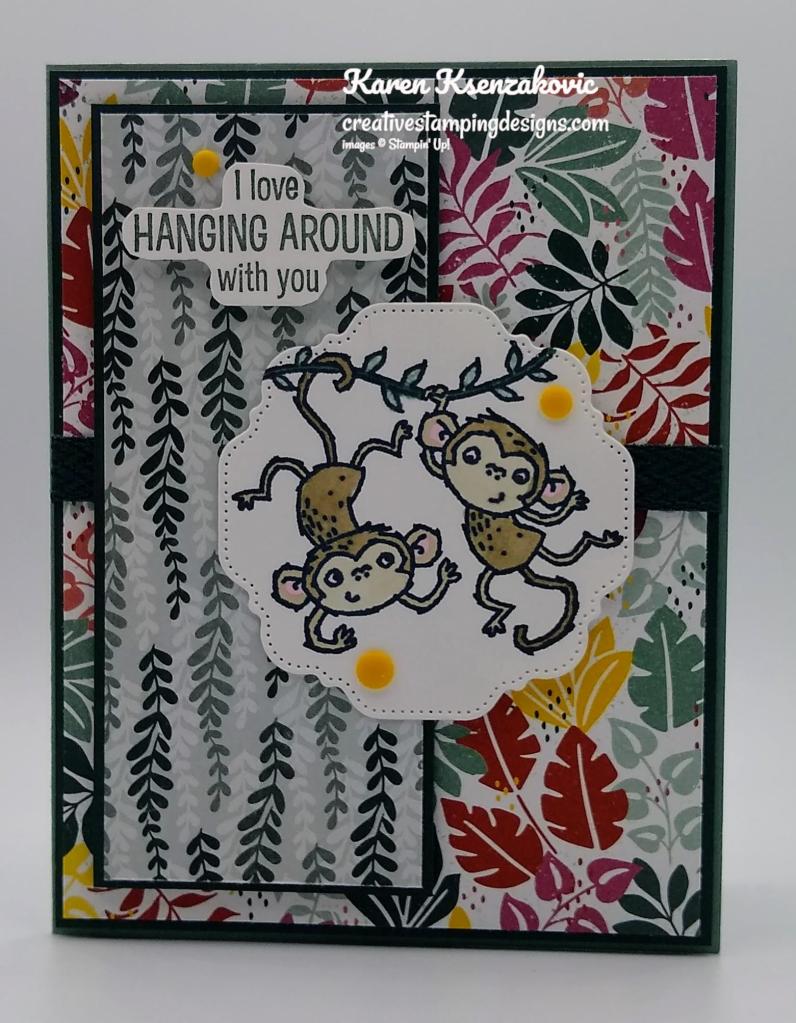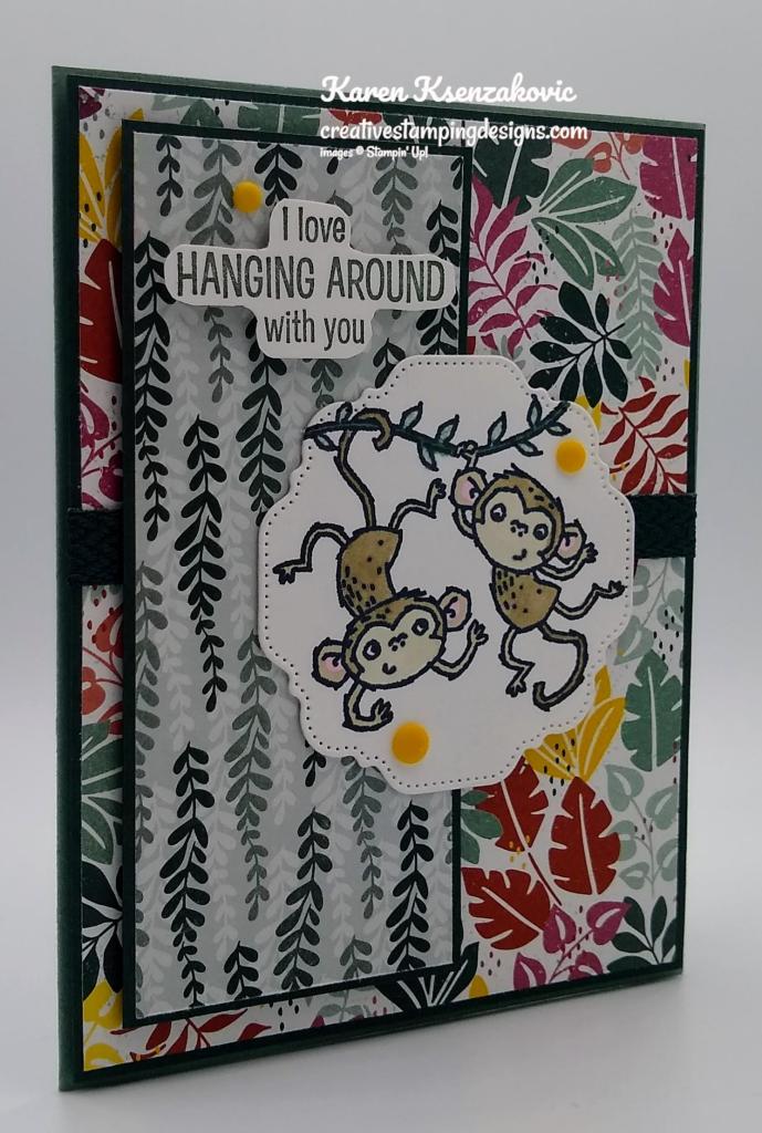 I adhered a panel of In the Wild DSP to the inside of the Soft Succulent card base. On a panel of Basic White cardstock I stamped the monkey image from the Catch You Later stamp set in Tuxedo Black Ink and colored it the same as the card front with my Stampin’ Blends Markers. I stamped the 2 sentiments from the Catch You Later stamp set by the monkey image. From the panel of Evening Evergreen cardstock I cut 2 of the string dies from the Hippo & Friends Dies. I cut 2 of the balloons from the Hippo & Friends Dies from scraps of Daffodil Delight and Real Red cardstock. I adhered the strings to the monkeys hands using Multipurpose Liquid Glue and the balloons to the strings using Stampin’ Dimensionals.