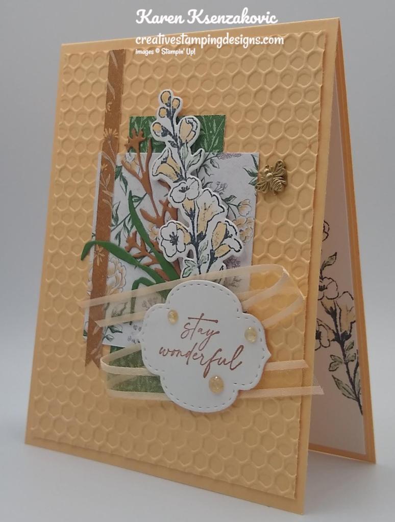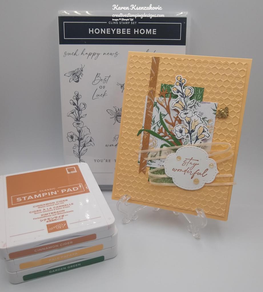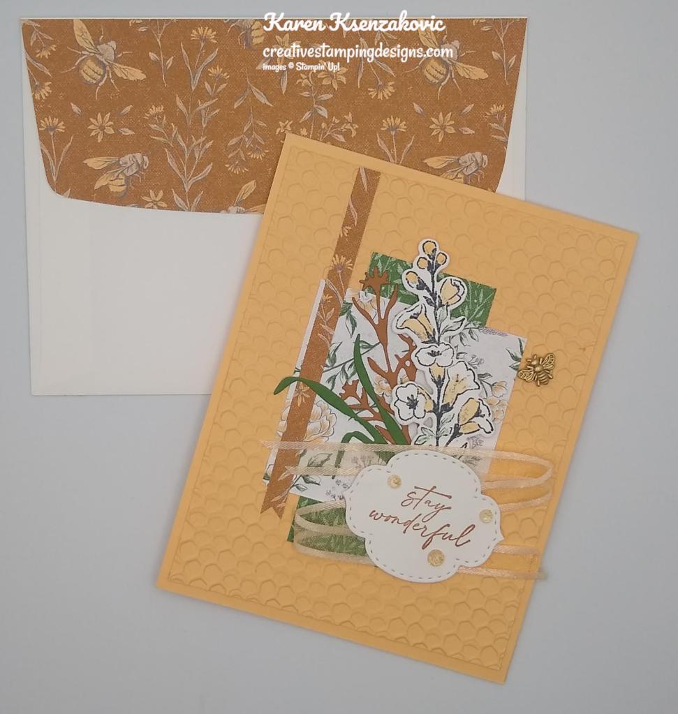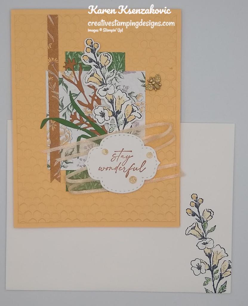 I used the Stampin’ Up! Honeybee Home Bundle, the Stampin’ Up! Queen Bee Bundle, the Hive 3D Embossing Folder and the Beautiful Shapes Die for my Clean and Layered card. I was inspired by the inspiration photo 193b with the colors and bees. All these Items will be retiring at the end of the month except for the color. If you would have told me that less than a week after I got the new In-Colors that I would be using the Wild Wheat, I would have said you were crazy. It’s my least favorite color, but it works so well with these stamp sets.